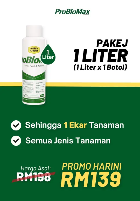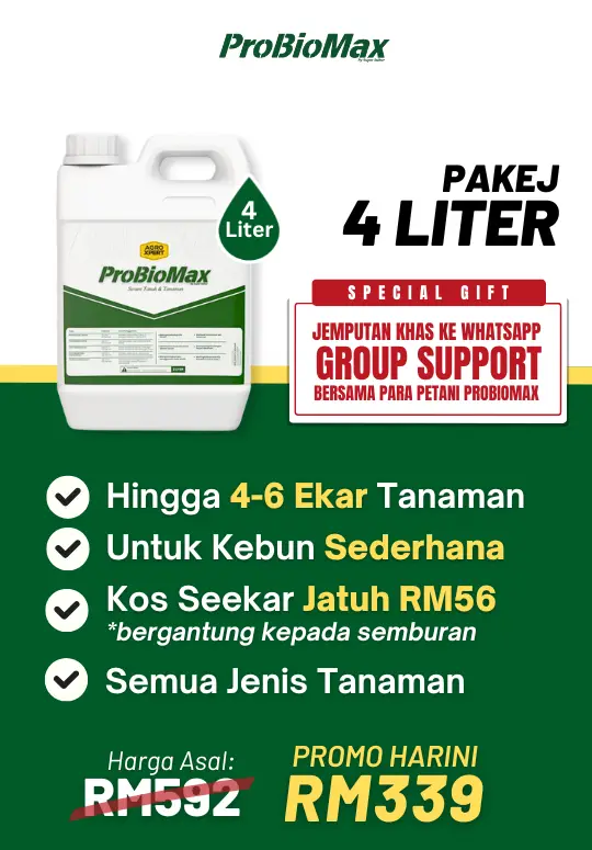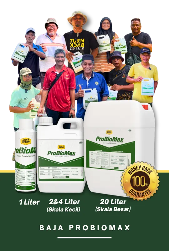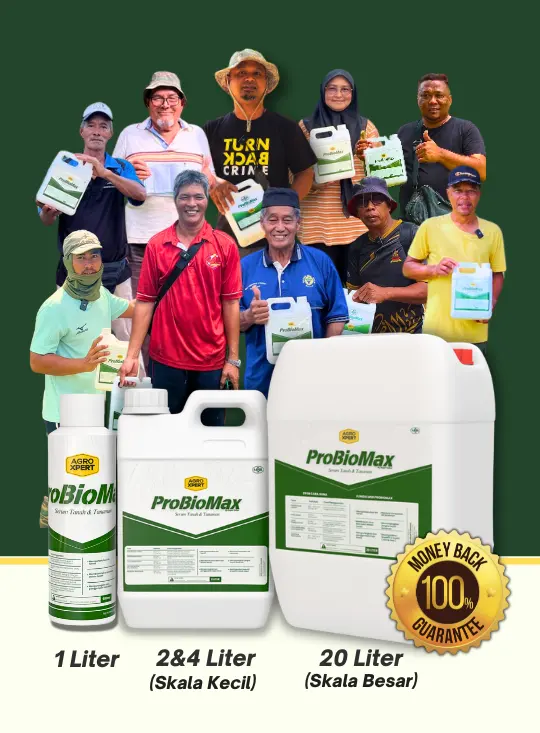 Probiotik dalam Probiomax betulkan struktur tanah, amino asid pula beri nutrien penting untuk tanaman. Hasilnya, tanah lebih subur, pokok lebih sihat, dan buah lebih lebat, berkualiti.